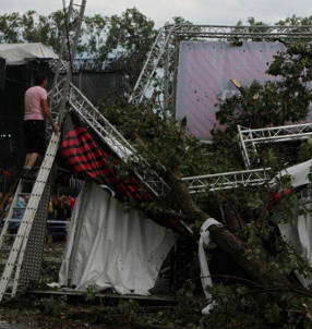 Pondasi yang dibangun untuk panggung pun rubuh. Para penonton berlarian mencoba menyelamatkan nyawa mereka di tengah hujan deras. Band The Smith Westerns yang tengah berlaga dalam festival tersebut pun mundur.