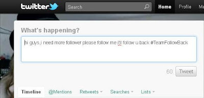cara lain nya ada juga dengan tulis tweet yang pake hastag ( tanda pagar ) #TeamFollowBack misal nya